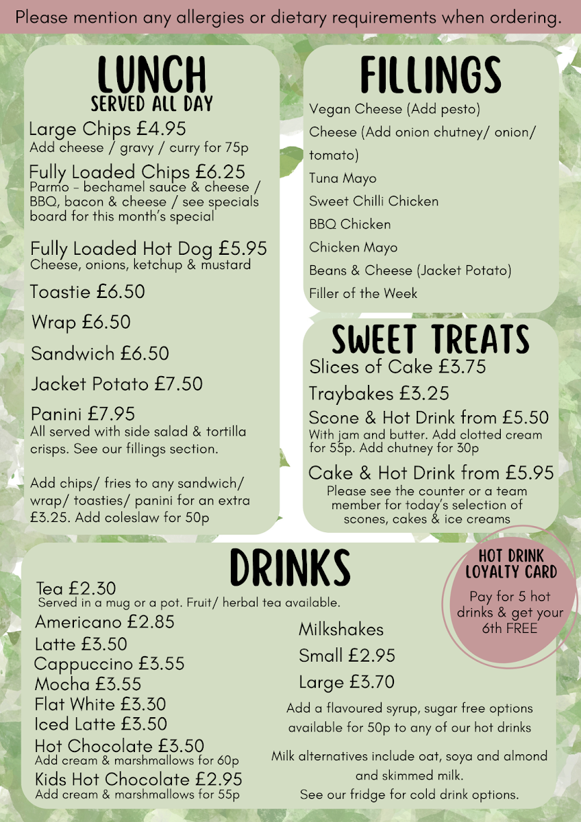 The menu offers an inviting selection of homemade delights that cater to various tastes and preferences. For lunch, indulge in the hearty Fully Loaded Hot Dog for just £5.95 or savor a comforting Toastie, perfect for a quick bite at £6.50. If you're in the mood for something more substantial, the jacket potato topped with your choice of fillings, available at £7.50, is a fan favorite that won't disappoint.